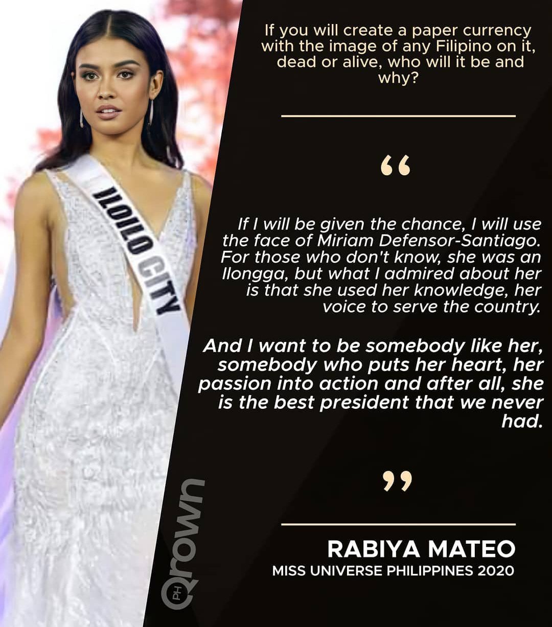 Rabiya's answer was, as a candidate, i know i'm not just the face of iloilo city, but i am here carrying hope and as a symbol of light in the darkest times.