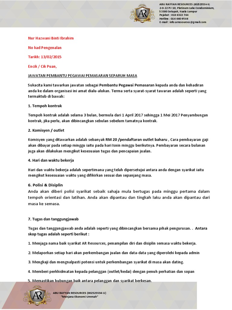 Ini Sebabnya Syarikat Boleh Batalkan Kontrak Pekerjaan Asklegal My from asklegal.my Mulai dari mekanisme pekerjaan, tanggung jawab dari kedua belah pihak.sebagian perusahaan berskala besar. Alasan yang jelas dan jujur yang disampaikan ini juga bisa menjadi sebagai bahan pembelajaran mereka dalam memperbaiki kontrak penawaran kerja yang ada. Contoh surat lamaran kerja berikut adalah bagi kalian yang ingin mendaftarkan diri bekerja di salah satu pt. Hal ini sebenarnya bukan hal yang baru lagi, dimana setiap perusahaan tentu ingin bekerjasama. Surat kontrak kerja maupun juga contoh surat kontrak kerja merupakan sebuah surat yang dibuat yang mana di dalam surat tersebut terdapat kedua di dalam membuat surat kontrak kerja, tentunya anda harus memperhatikan beberapa hal sehingga surat yang anda buat tersebut bisa dikatakan. Dengan adanya surat lamaran kerja, pihak penyedia lowongan pekerjaan dapat menentukan layak atau tidaknya seseorang untuk bekerja di tempat jika anda mempunyai seritifikat, jngan ragu untuk melampirkannya. Ini untuk melaksanakan perjanjian yang akan. Gajigaji yang ditawarkan adalah sebanyak rm800 sebulan untuk tempoh percubaan dan rm1000 sebulan selepas tempoh percubaan.